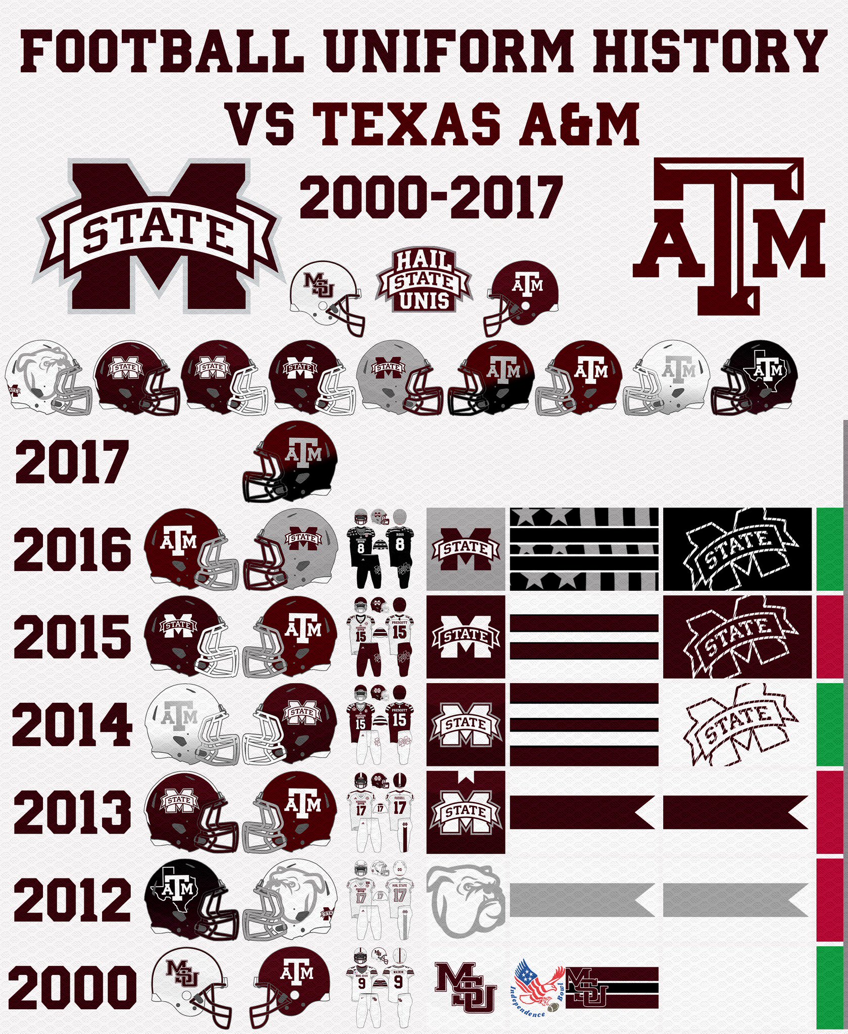 Opponent Graphics show the helmet matchups and MSU uniform combo for every game since 1980 against every team that the Bulldogs have played since 1980. Situational Graphics show the Bulldogs' history in certain uniform elements and combinations (currently included are black jerseys, gray pants, alternate white helmets, white jerseys at home, matte maroon helmets, and maroon jerseys with maroon pants.)